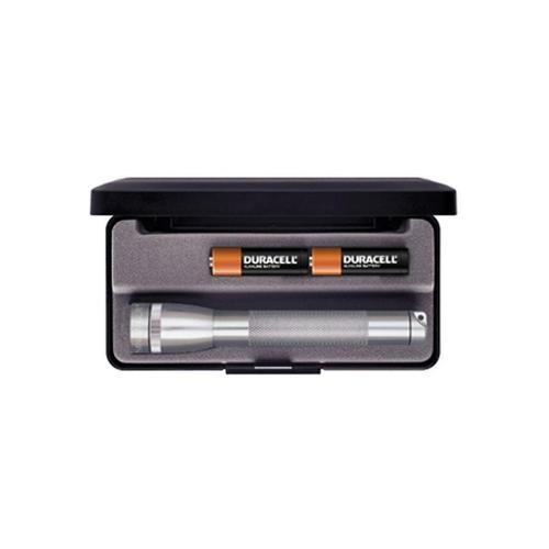 Maglite Solitaire flashlight set with Duracell AAA battery, keychain, and storage case for portable illumination.