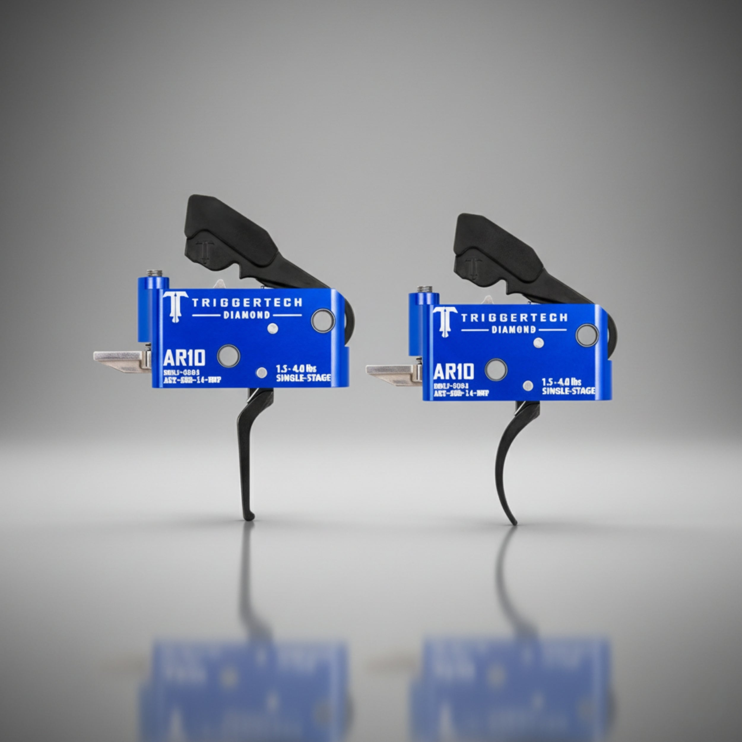 Two TriggerTech AR10 trigger mechanisms on a gray background