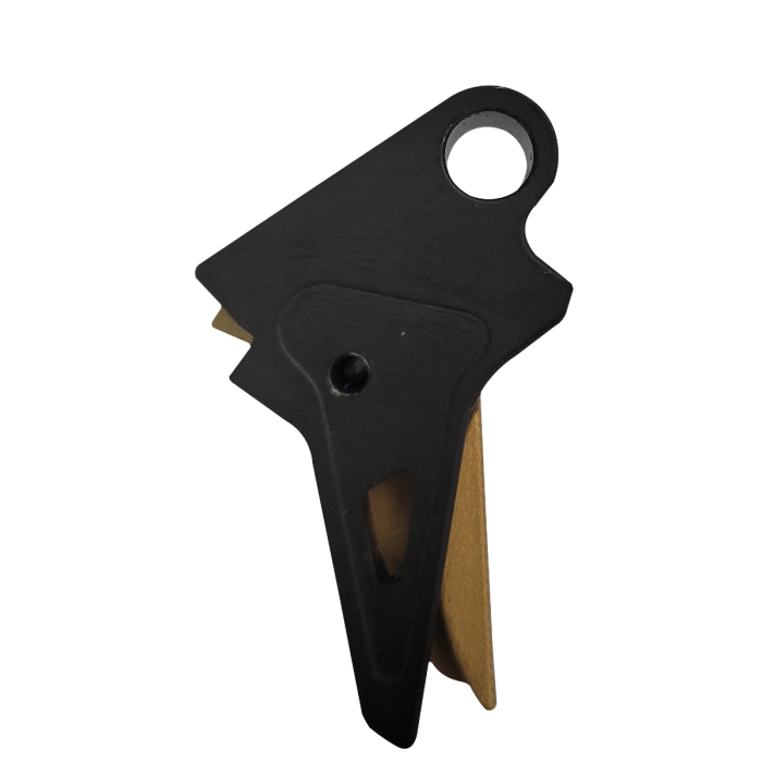 Enhanced aluminum flat trigger assembly for Canik TP9 series pistols, featuring a textured grip for improved control.