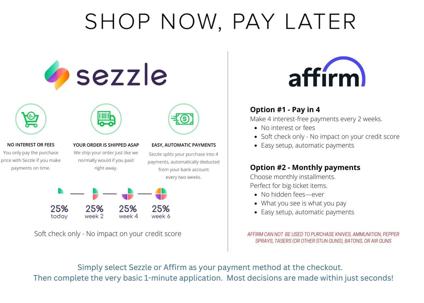 ✅ Use Sezzle, another fantastic Buy Now, Pay Later partner that works with ALL products in our store — no exceptions or restrictions!