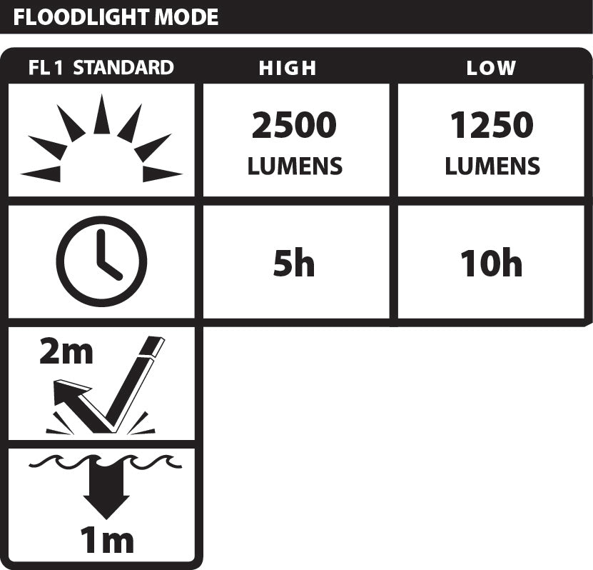 The integrated rechargeable Li-ion battery offers up to 5 hours of runtime on high and 10 hours on low. AC and DC power supplies provide backup charging options, so you are never left without light. The NSR-1516 is waterproof with an IP-X7 rating and meets NFPA-1971-8.6 (2018) standards. Every package includes the area light, adjustable handle, AC power supply, and DC power supply.