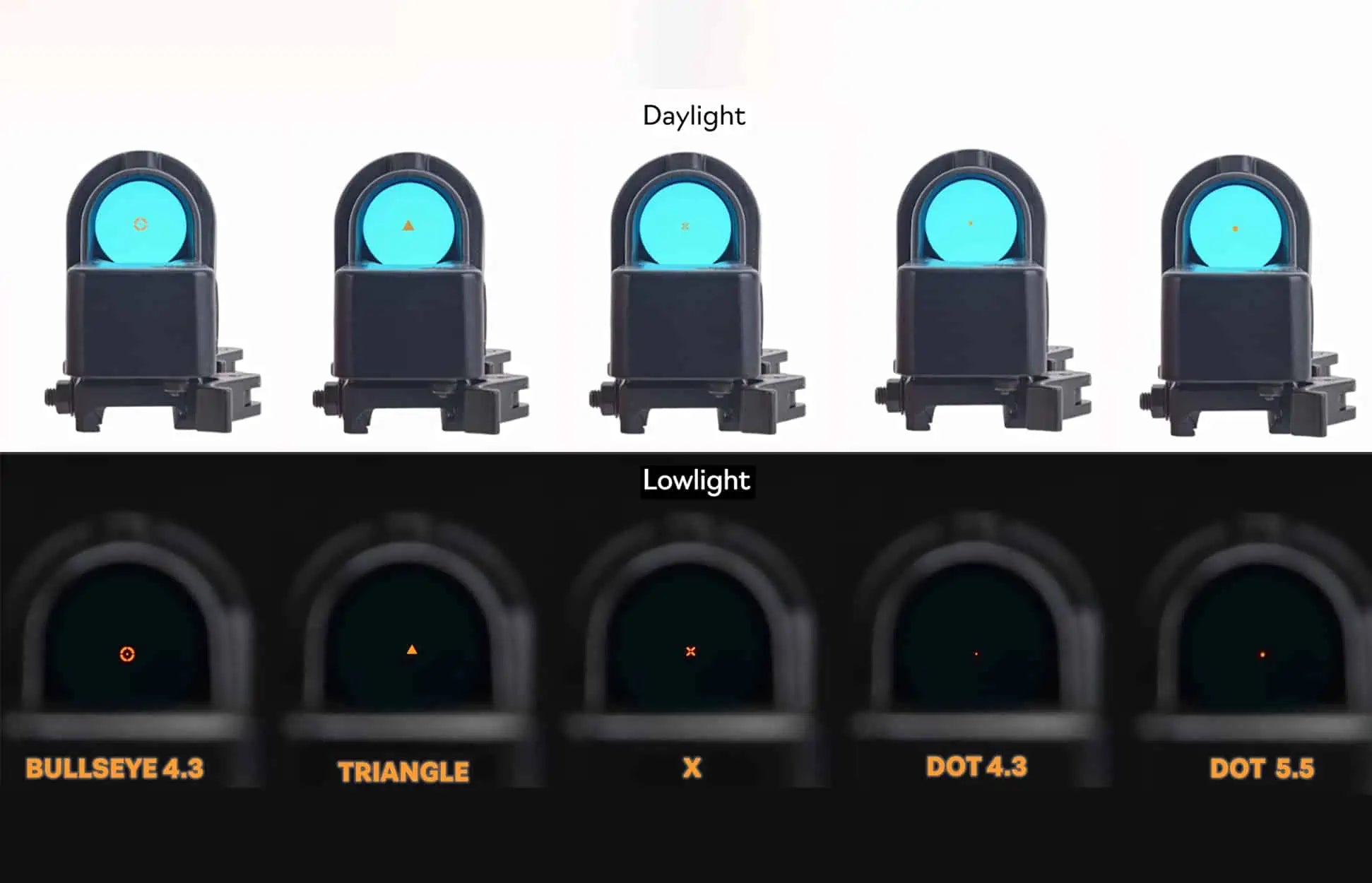 | Diámetro del punto de mira | 4.3 MOA/ 5.5 MOA/ Triángulo/ Diana/ “X” abierta *algunas opciones pueden no estar disponibles |