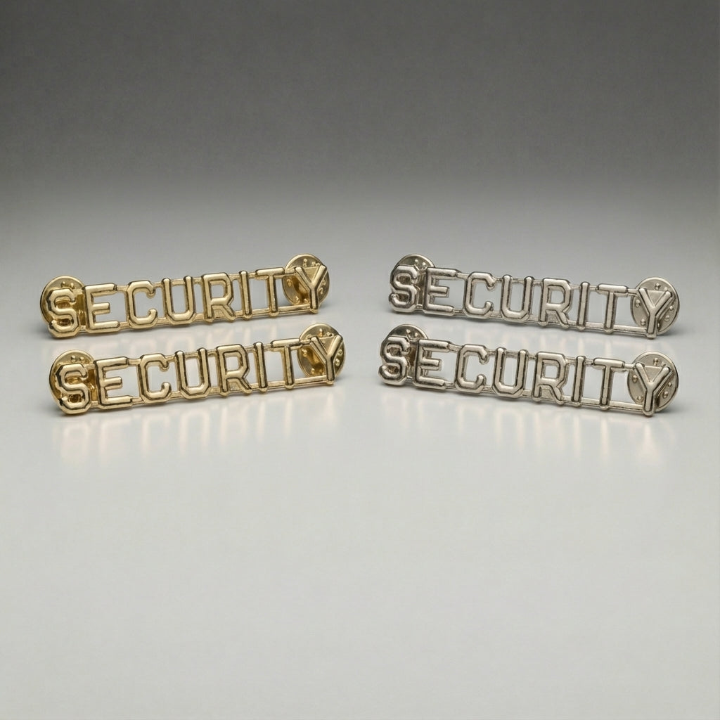 <p style="text-align: center">[producto de marca]</p>Give your officers a crisp, professional look with the First Class Uniforms SECURITY Collar Pin Pair. Each 2 inch metal pin spells out “SECURITY” in bold block letters with dual clutch backs for a secure hold. Choose gold tone IN05 or silver nickel IN06 to match your badge and nameplate. Sold as a pair, these pins help security staff stand out in busy venues, campuses, hospitals, and retail environments.