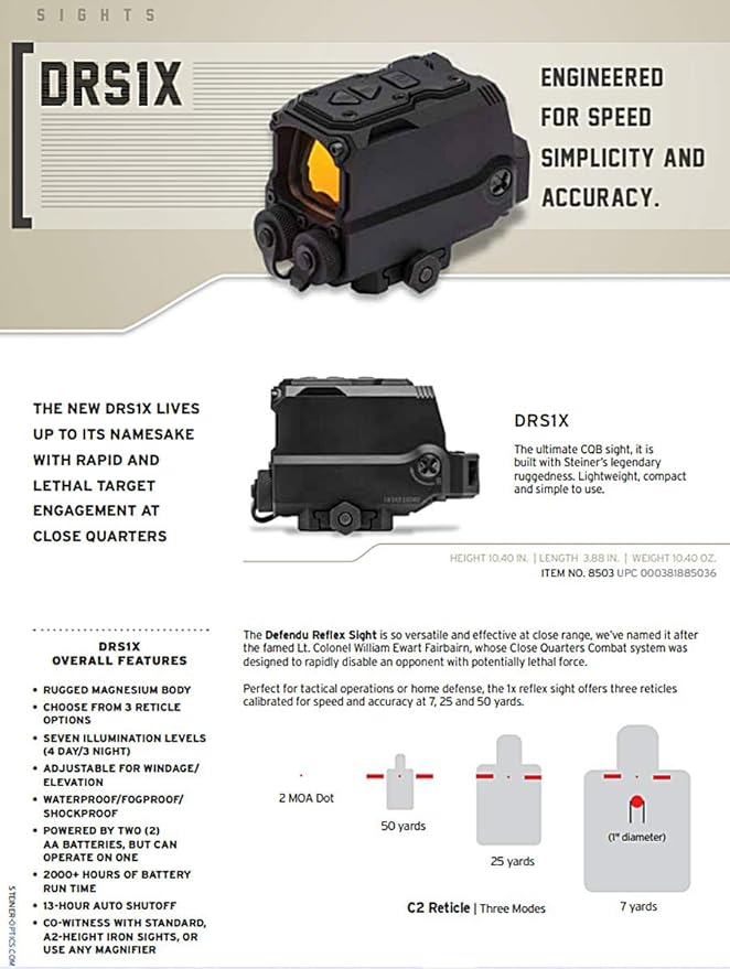 Steiner Binoculars DRS 1X Reflex Battle Sight 8503 boasts rapid target engagement at close quarters. Named after Lt. Colonel William Ewart Fairbairn, it offers three reticles for accuracy at various distances. Rugged, lightweight, and easy to use, it has 1x magnification and seven brightness levels.