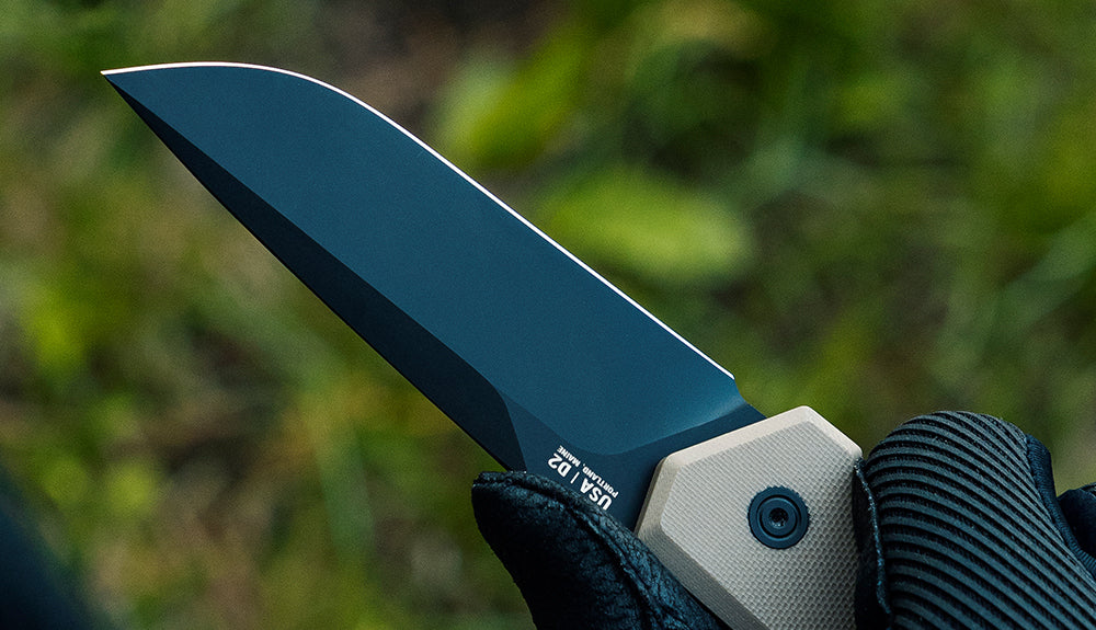 • Blade: Drop point, black finish, titanium-coated D2 steel