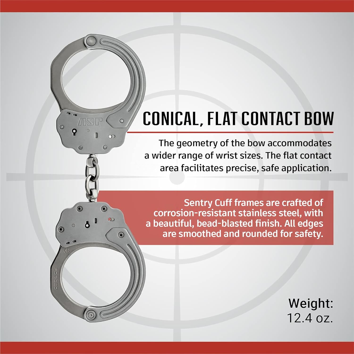 Officers choose Sentry Chain Handcuffs for patrol, transport, and booking because they balance strength and comfort. Flat bow contact areas help you apply precise pressure. Dual-sided keyways and double-lock slots speed application and release from either side. Weight averages 12.4 to 13.28 oz depending on finish run. Overall length is 9.4 in and width is 3.3 in. The bead-blasted finish resists corrosion and feels smooth in the hand.