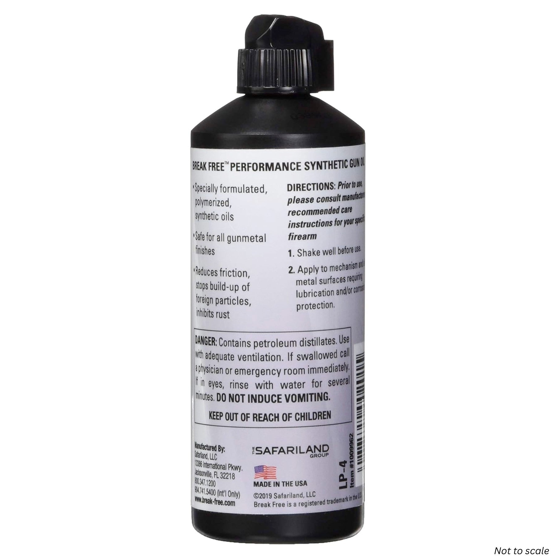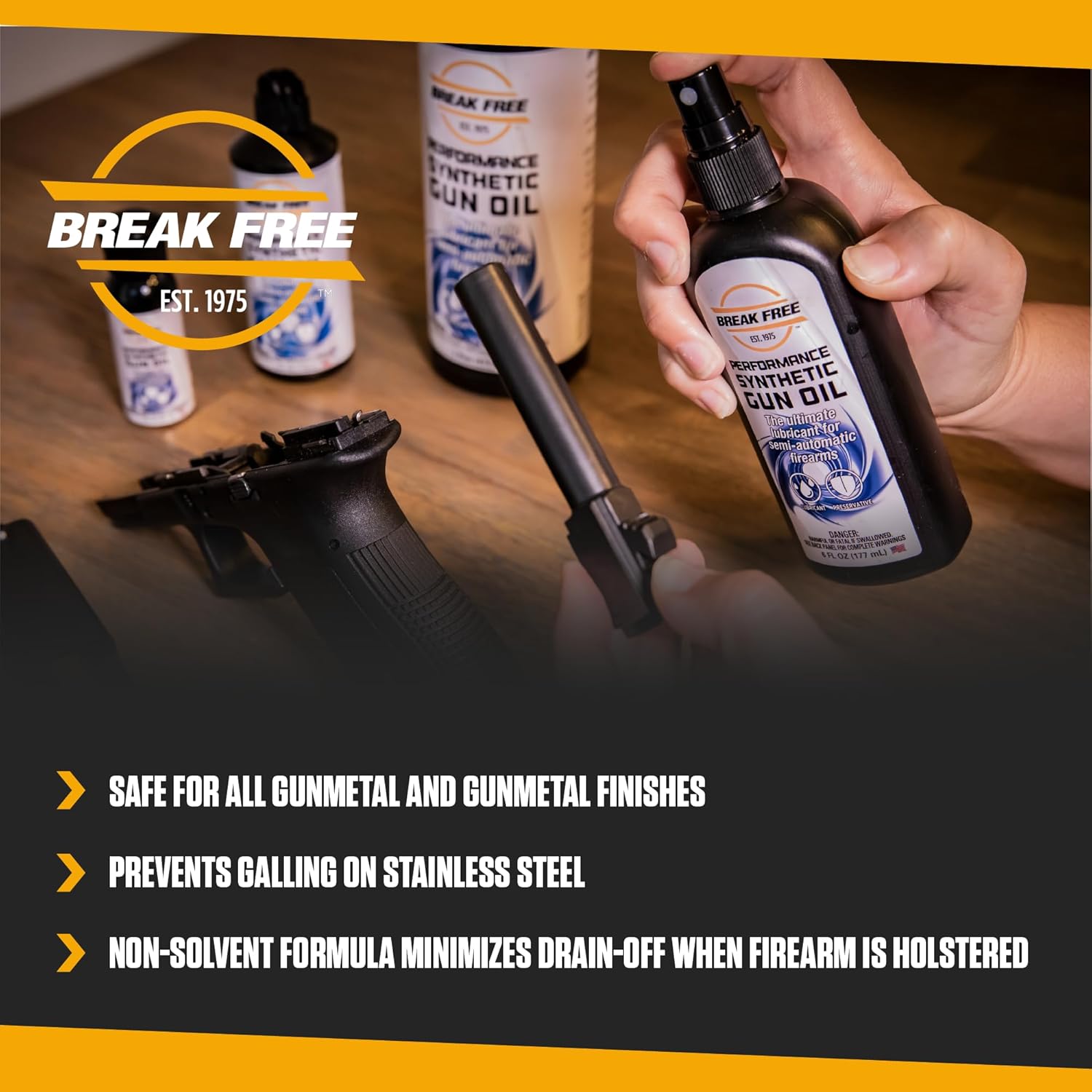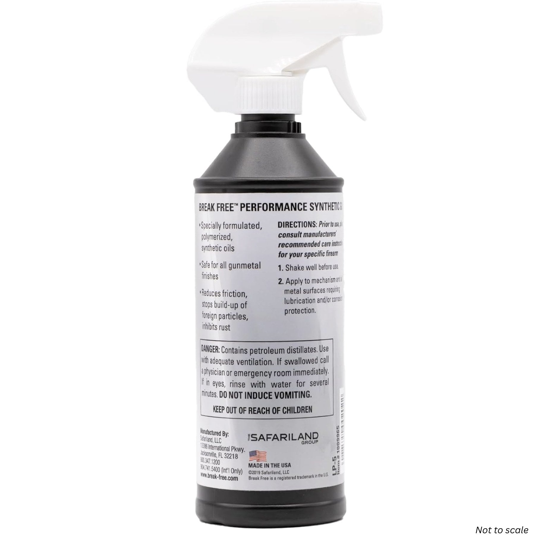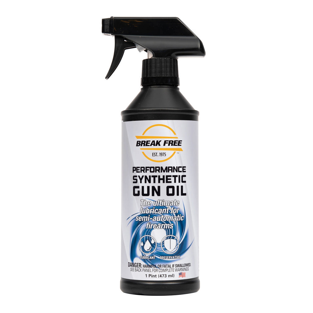 Break Free Performance Synthetic Gun Oil delivers clean, consistent cycling during sustained fire. The polymerized synthetic blend reduces friction, resists grime, and helps prevent rust and stainless galling. It is safe for blued steel, titanium, and polymer composite firearms. The non-solvent formula stays put in holsters. Choose a portable 4-oz squeeze bottle or a 16-oz trigger spray. Made in the USA and trusted by duty professionals and enthusiasts.