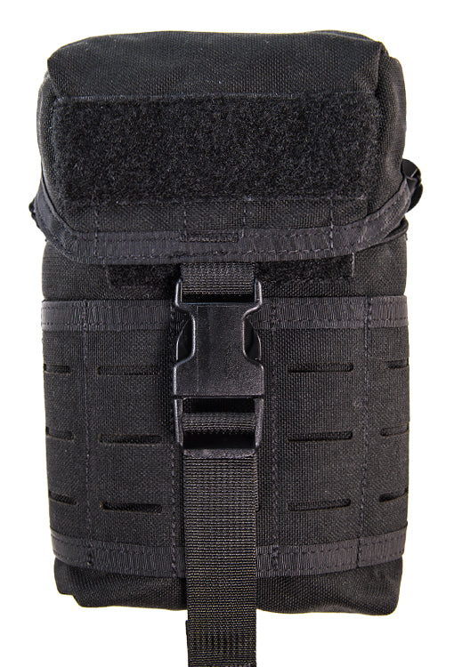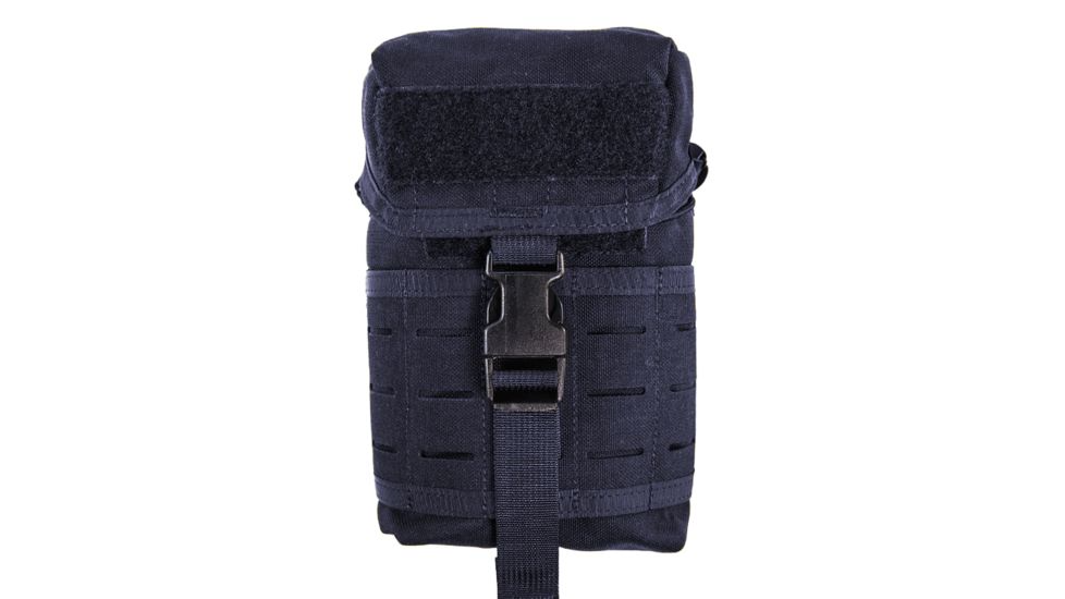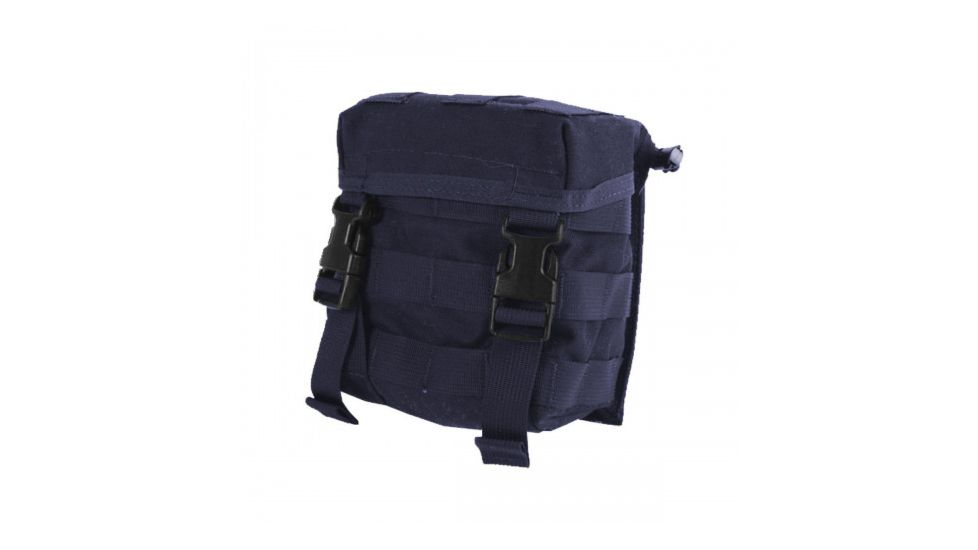 This pouch easily holds a 2 qt. canteen, M-249 Saw drum, JetBoil Cooking System or numerous rifle magazines. It is covered on front, sides and top with MOLLE/PALS webbing for additional modular pouches. Uses two 1 side release buckles for closure with hook and loop with silencing strip. The top opening also has adjustable shock-cord retention for added security of contents.