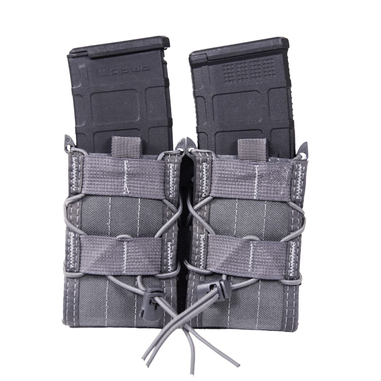 This unique pouch is constructed from injection-molded polymer brackets, heavy-duty nylon and shock cord lacing to both expand and lock just about any magazine in place. Securely holds most rifle magazines, magazines deploy easily and silently on demand. Also fits certain radios, flash bangs, and smoke grenades. Strip of loop fastener sewn inside for additional contact and grip.