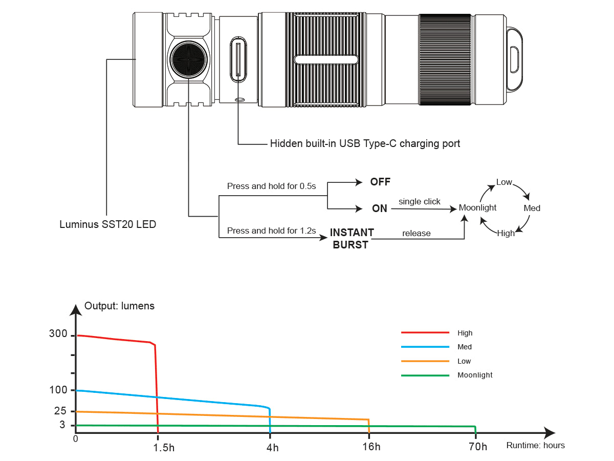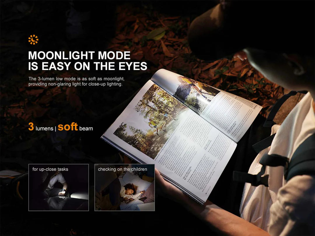 Lock: with the light switched off, double click the switch within 0.5 seconds to lock the light, the light will blink twice on Moonlight to indicate locked status. Unlock: with the light locked, double click the switch within 0.5 seconds, the light will be unlocked and activated on Moonlight. *In locked status, clicking or pressing the switch will activate 2 one-second blinks on Moonlight to indicate locked status.