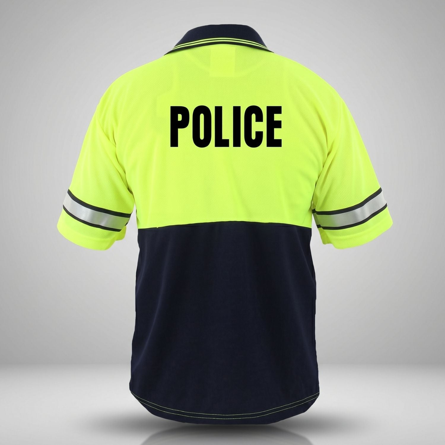 The two-tone lime yellow / dark navy colorway coordinates with standard police, security, and traffic control uniforms where high-visibility compliance is required or preferred. The reflective sleeve stripes meet ANSI/ISEA 107-2004 Class 2 standards, which satisfy federal high-visibility requirements for workers near roadway traffic.