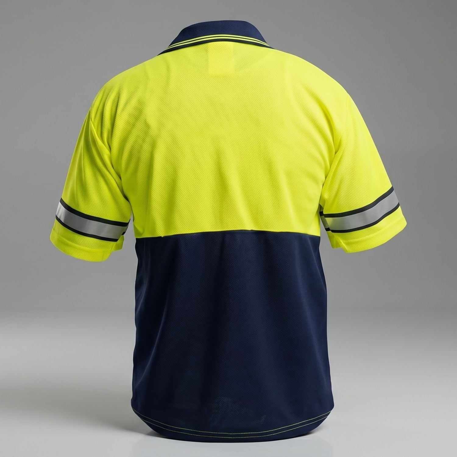 Two-Tone Colorblocking: Fluorescent lime yellow upper body transitions to a dark navy lower body, creating maximum contrast and professional appearance