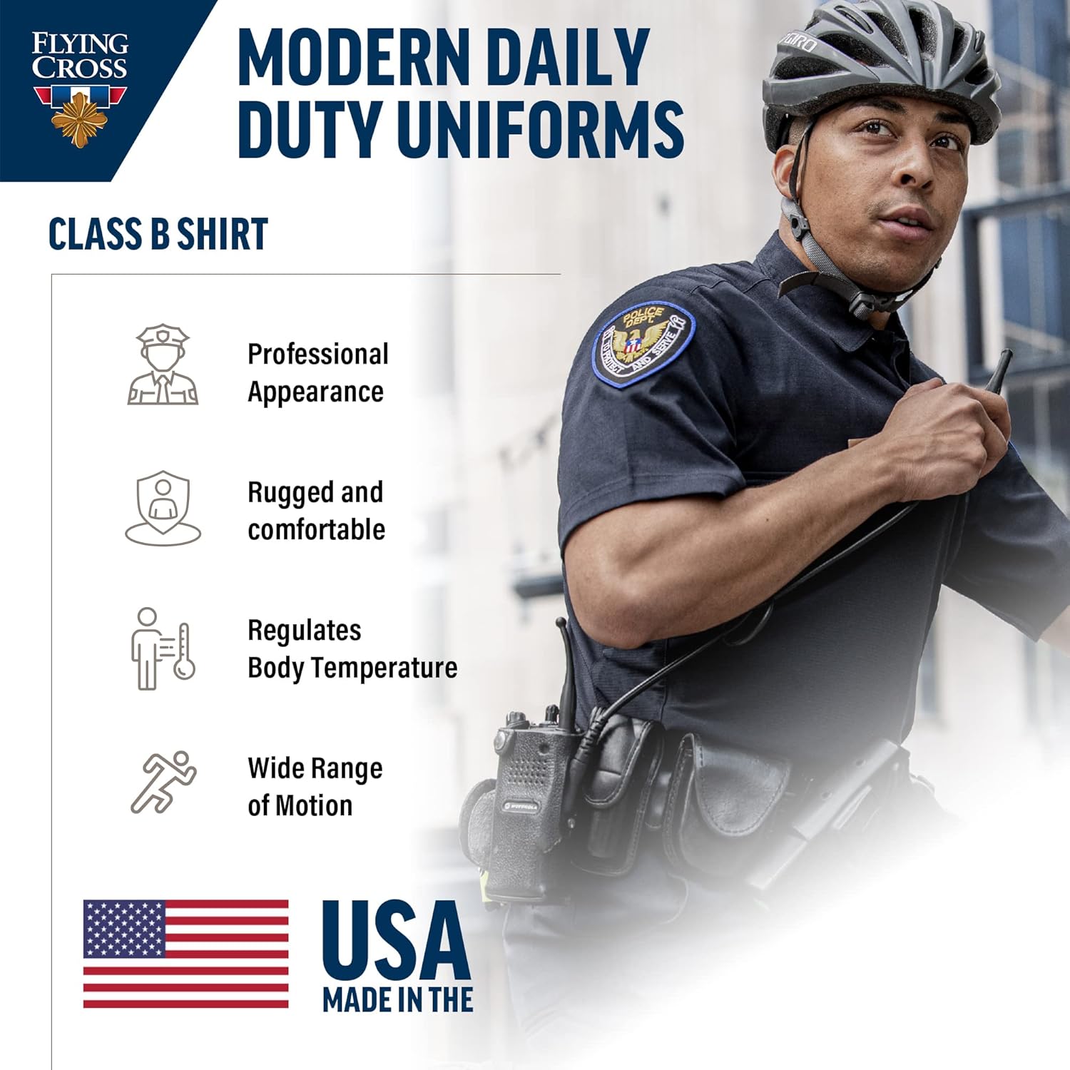 The Flying Cross FX STAT Men's Class A Long Sleeve Hybrid Uniform Shirt modernizes police uniforms with durability, stretch, and UVA/UVB protection, ideal for undergarments or standalone wear.