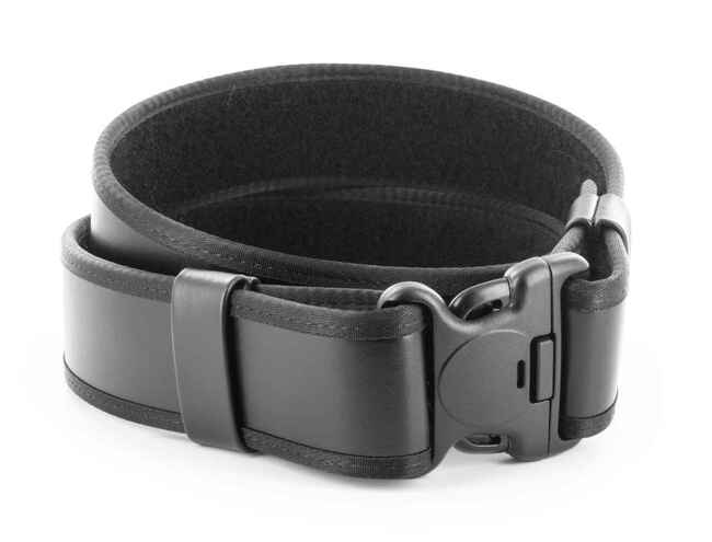 The Gould & Goodrich L-Force duty belt looks like leather, but is actually made from a high-strength laminate material to increase durability and wear resistance. It features sleek nylon edge bindings for increased wear-resistance, as well as to round off any rough edges. The no-crush design increases its ability to support heavy loads, making it ideal for carrying a full law enforcement loadout, and its 2.25 inch width is compatible with the widest possible range of holsters and pouches. Its no-shine hardware won't give away your position by reflecting light, and its Cop-Lok buckle uses a three-point release to enhance strength and security. The belt is loop lined, allowing it to interlock with their X55 pants belt.