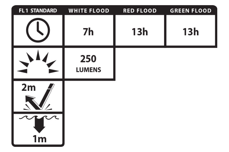 This headlamp is engineered for durability and performance. It is built from tough engineered polymer and offers IP-X7 waterproof protection, making it ready for rain or wet conditions. The headlamp delivers 250 lumens of white light on high for up to 7 hours, or 60 lumens on low for up to 35 hours. Red and green wide-beam floodlight modes each run for over 12 hours, perfect for night vision or signaling. Dual switches on the front allow fast, intuitive control between white low, white high, red, and green modes. An integrated strobe feature adds versatility for emergencies.