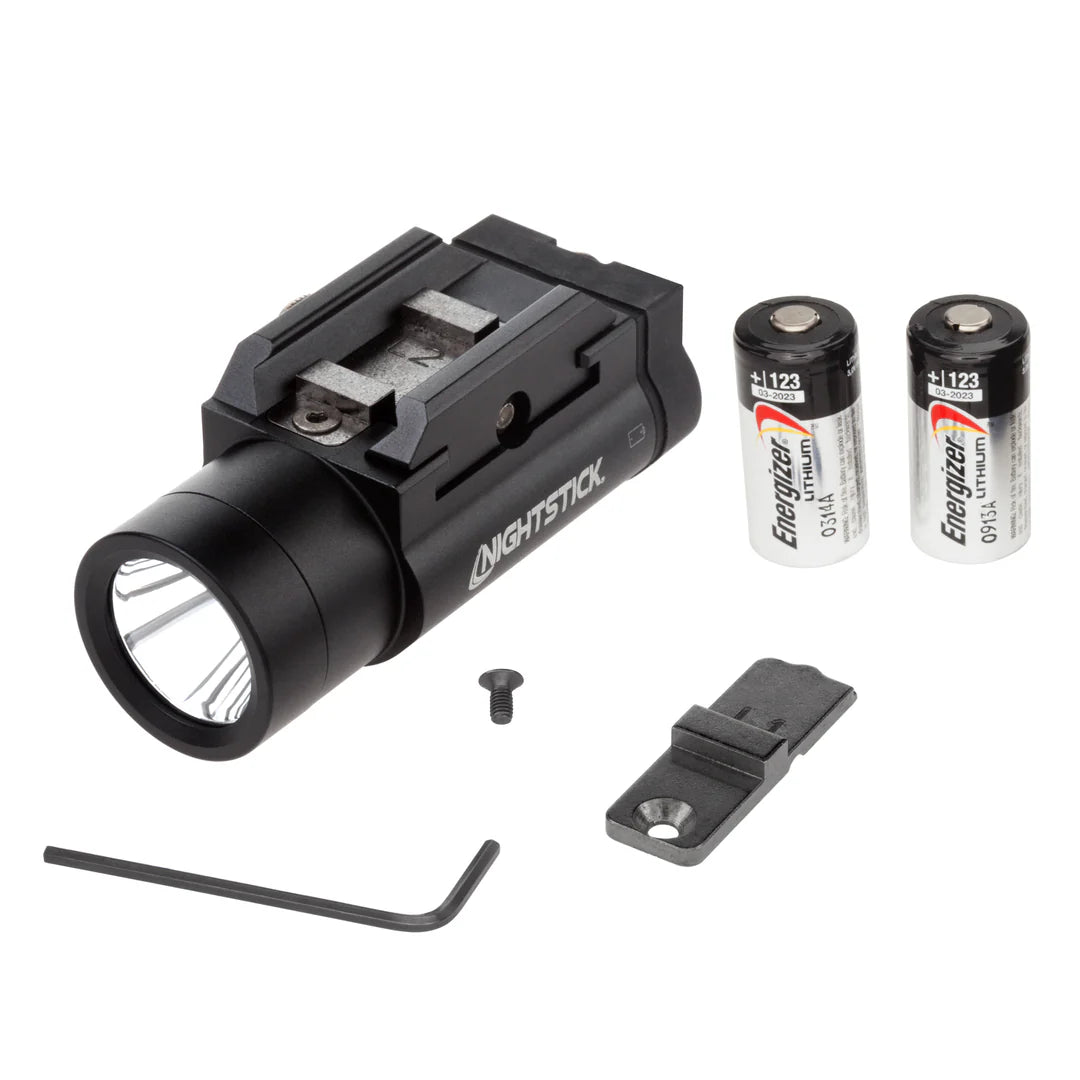 The Nightstick Xtreme Lumens Tactical Weapon-Mounted Light is designed for long guns, providing 850 lumens of bright LED light with a 245-meter beam distance. It features a durable, waterproof aluminum housing, momentary and constant-on modes, and easy installation on Picatinny rails. Ideal for tactical use, it includes two CR123 batteries and an Allen wrench for quick setup.