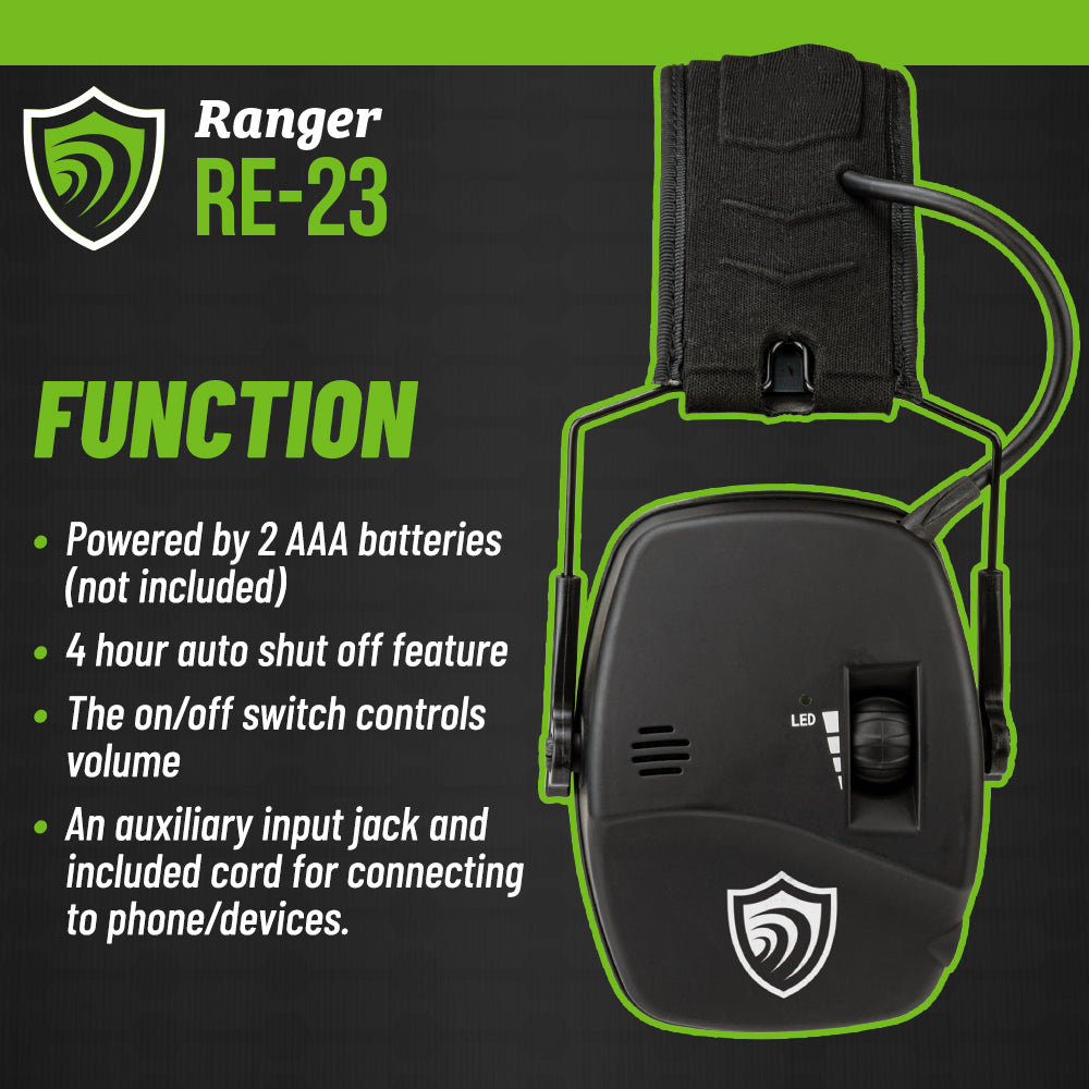 The Otis Technology EarShield™ Ranger Electronic Pro Earmuff FG-ES23EBK offers powerful noise protection while keeping you connected to your surroundings. Whether you're at the range or in the field, these electronic earmuffs protect your hearing from gunfire while letting you clearly hear commands, conversations, and environmental sounds. With a 23dB Noise Reduction Rating (NRR) and an ultra-fast attack time of 0.5 milliseconds, loud noises are blocked instantly, but important sounds come through loud and clear.