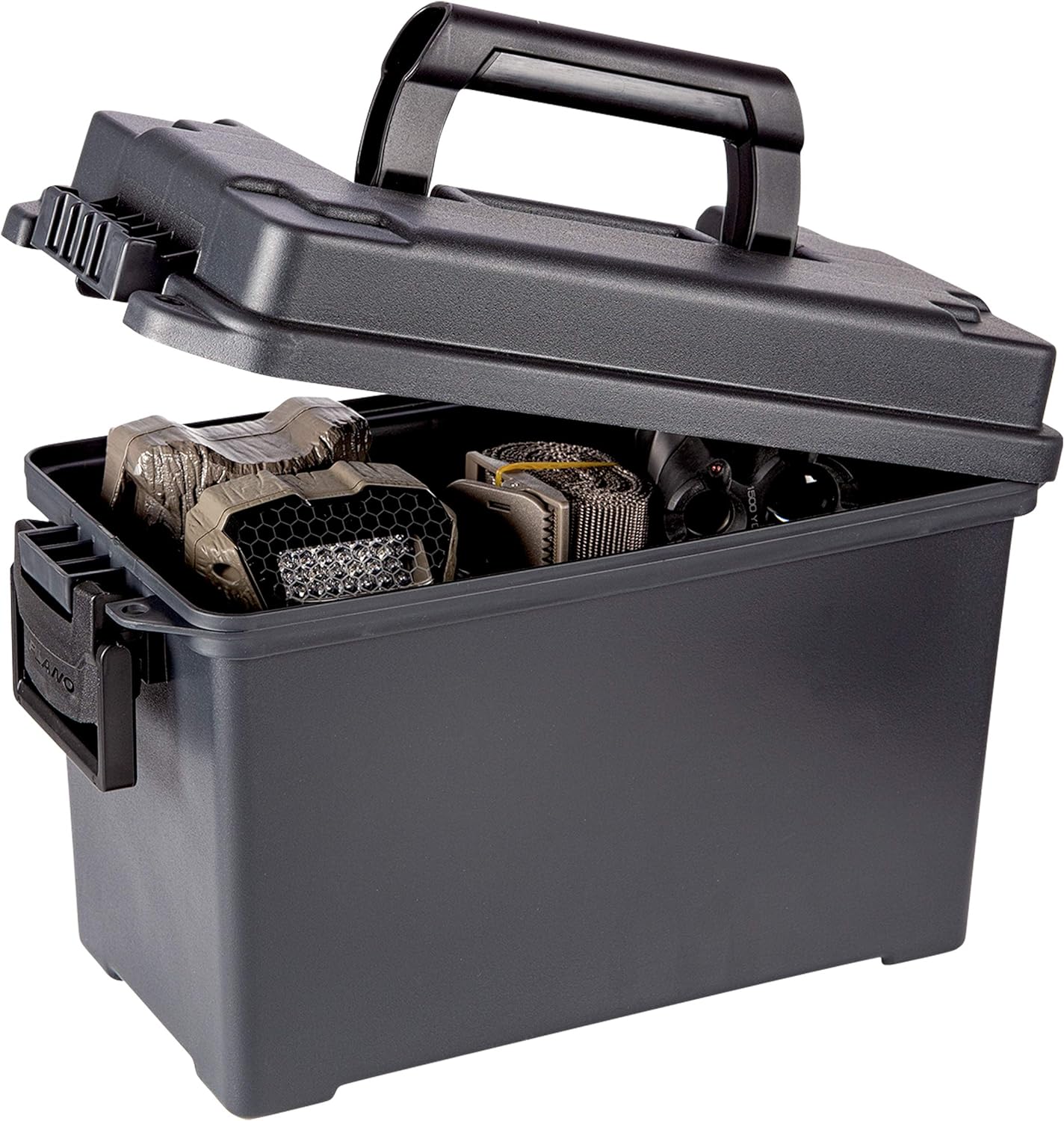 Plano sized the interior around .50 caliber storage, and it also fits boxes of 5.56mm ammunition. It typically holds about 6 to 8 boxes, depending on packaging. It also works as a grab-and-go catchall for tools, electronics, and small accessories in the garage, basement, or work shed.