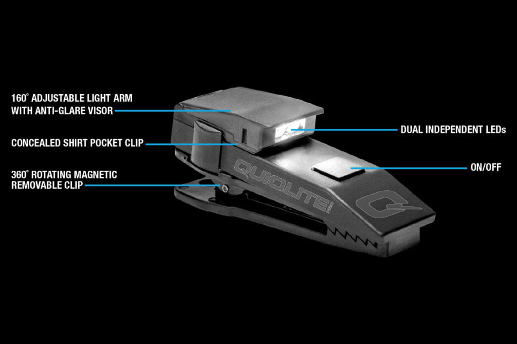 QuiqLitePro has unique features that offer up to 10 to 20 lumens of light on demand with the push of a button. With QuiqLitePro's adjustable light arm, you can set your perfect lighting angle without having to hold a flashlight in your hand, under your arm, or between your cheek and shoulder. QuiqLitePro will make your job easier and safer without affecting your night vision!