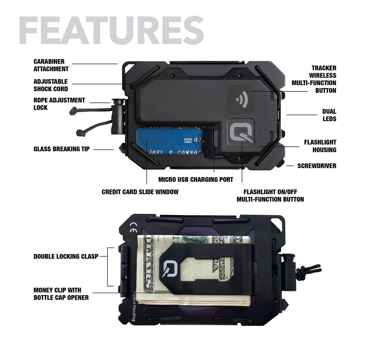 Quiqlite TAQTracker Slim Bluetooth Tracking Locator Wallet with Rechargeable LED Flashlight, Safety Strobe and Multi-Tool