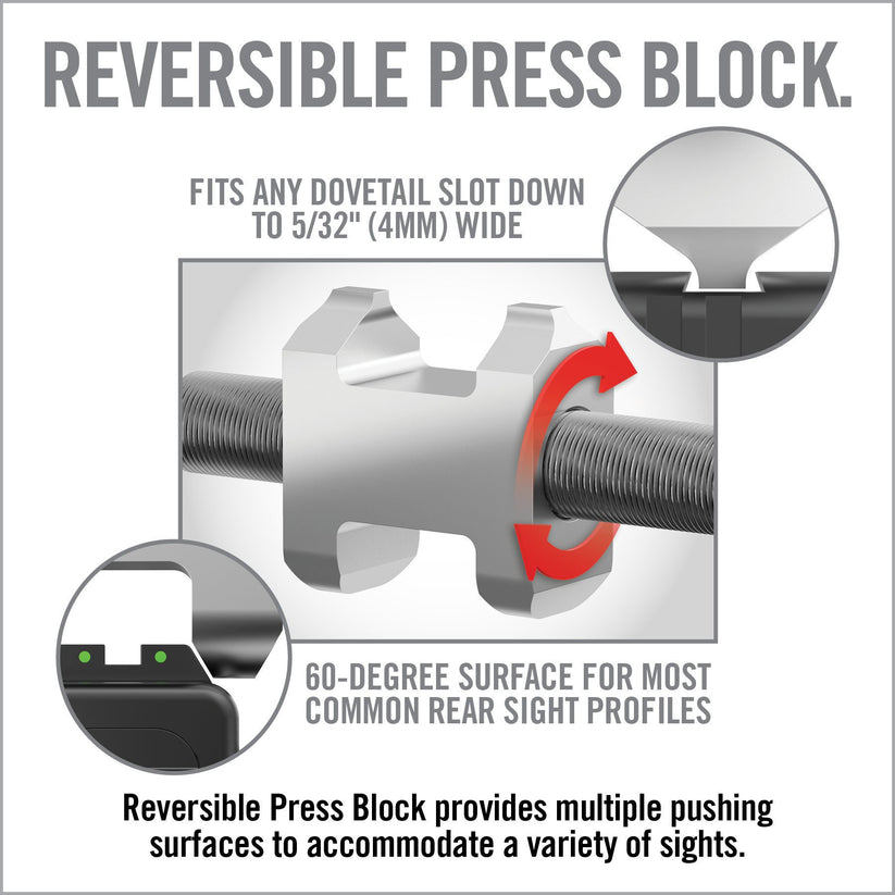 Built to handle tough jobs with ease, the Master Sight Pusher® features an oversized Easy Torque™ Handle that provides maximum torque with minimal effort. Its reversible press block fits dovetail slots down to 5/32" (4mm) and includes a 60-degree surface for compatibility with common rear sight profiles. Adjustable non-marring contact surfaces securely hold the slide in place, protecting your pistol’s finish while ensuring precise alignment. The tool’s versatile slide cradle accommodates a wide range of pistol models, providing steady support during both sight removal and installation.