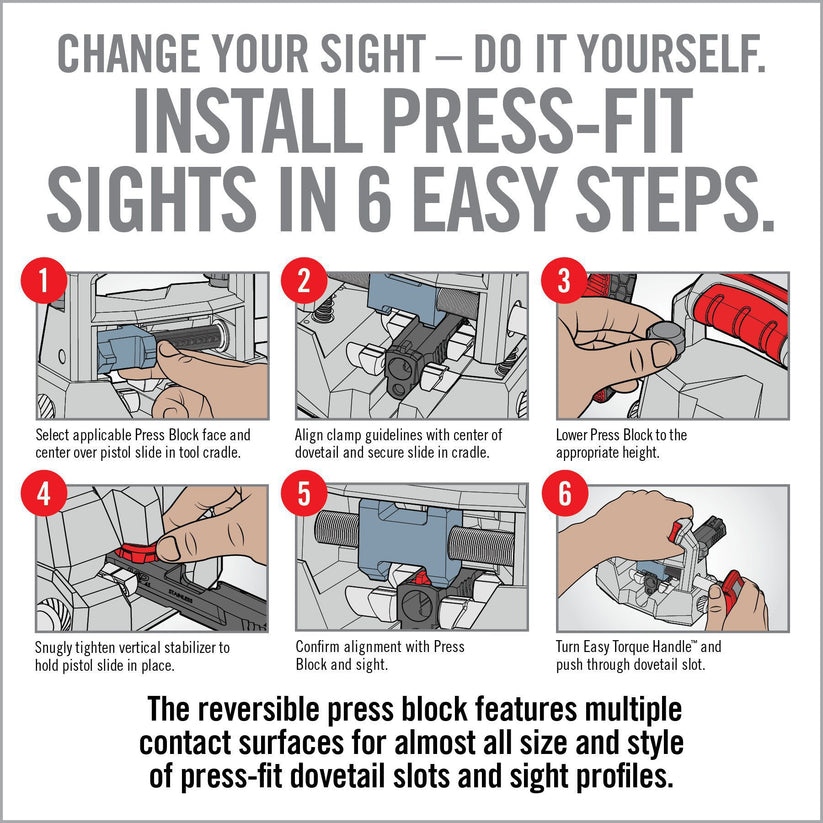 • Professional-grade tool for adjusting and replacing press-fit pistol sights