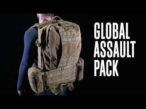 The Rothco Global Assault Pack Coyote Brown 23520 is a spacious, M.O.L.L.E compatible backpack with a multitude of compartments, including a hydration bladder, zippered pockets, and removable side pouches. It features adjustable mesh padded shoulder straps and a breathable padded back. Ideal for outdoor enthusiasts seeking organized gear storage.