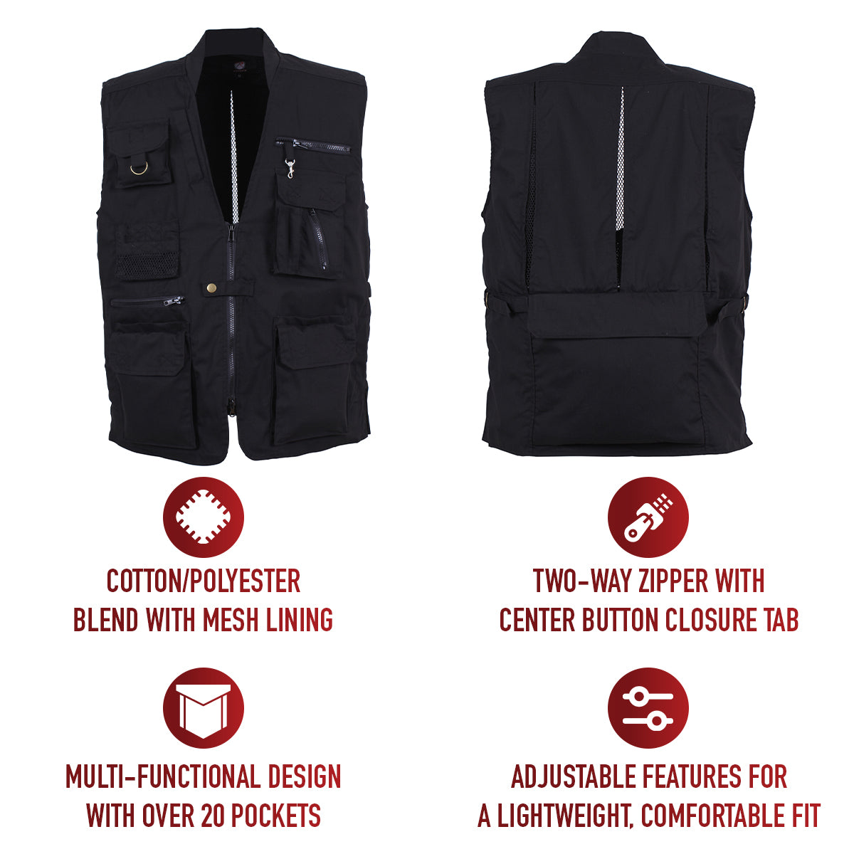 Rothco's Plainclothes Concealed Carry Vest features over 20 pockets for everyday carry and concealed carry. It has ambidextrous concealed carry pockets, magazine pouches, and various other zippered pockets. The vest made of cotton/polyester blend, ensures comfort and lightness for daily wear.
