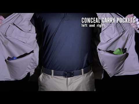 • Ambidextrous concealed carry pockets, padded to prevent the imprinting of the firearm, with hook and loop closures for easy, safe, and quick access.