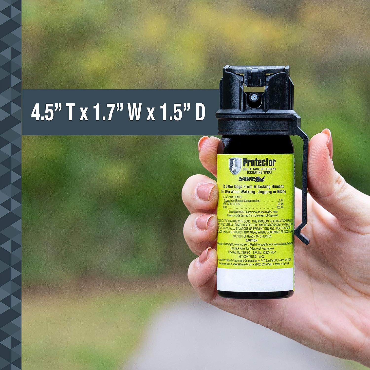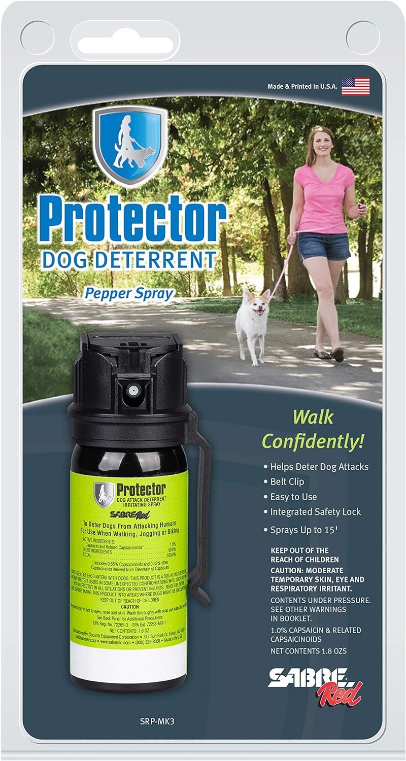 SABRE RED SABRE Protector Dog Pepper Spray & Belt Clip, Fast Flip Top Safety, 7 Bursts, 15-Foot (4.6-Meter) Range, Humane Dog Attack Deterrent, Max Strength Allowed By EPA for Self Defense, 1.8 fl oz