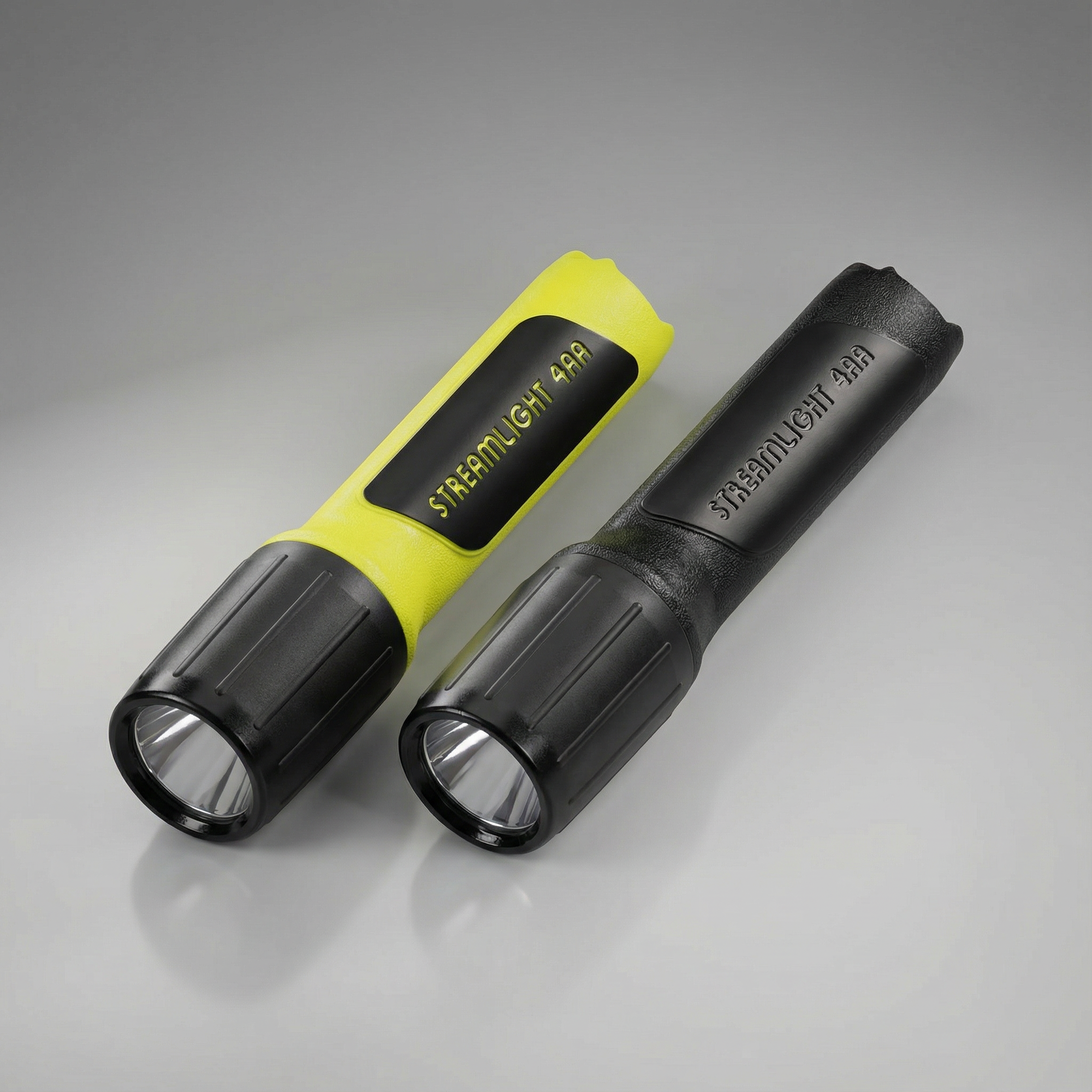 The Streamlight 4AA ProPolymer® Lux Division 2 Flashlight is a durable hazardous location flashlight built for industrial sites and duty use. Choose Black (MPN 68344, UPC 080926683440) or Yellow (MPN 68244, UPC 080926682443). It delivers 200 lumens with 12,000 candela and a 219-meter beam distance, plus a 6-hour runtime on four AA alkaline batteries. Streamlight states the beam is 10x brighter than a high-intensity LED.