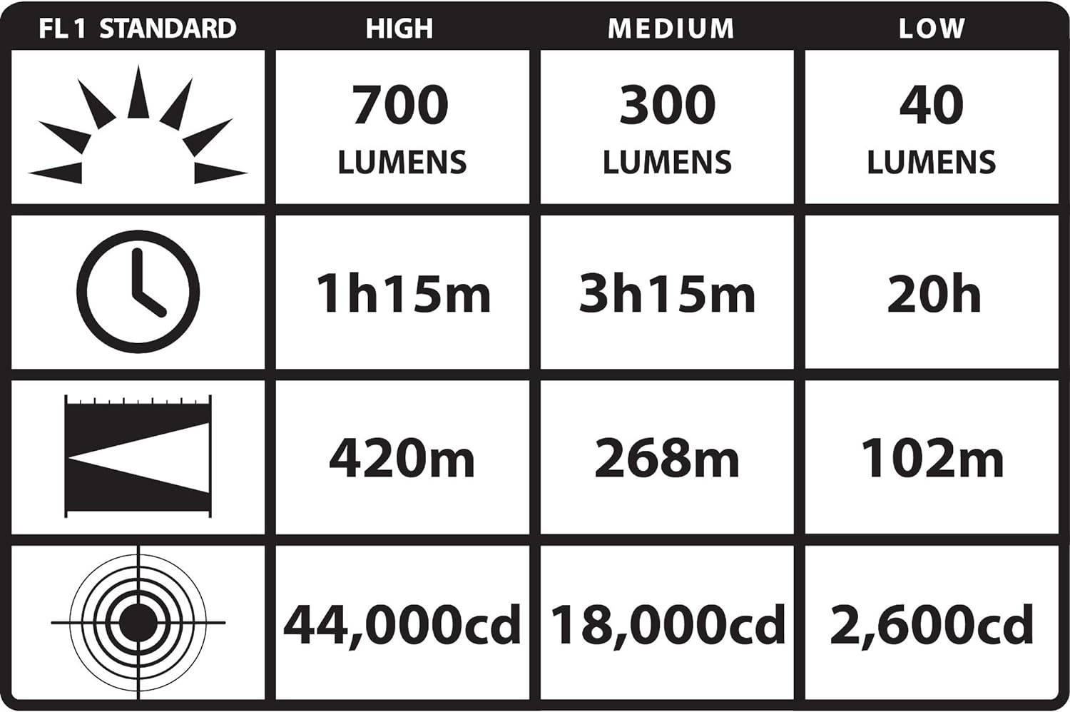 The flashlight comes with three power settings and a strobe mode for signaling or dazzling targets. It also includes three selectable programs that determine which modes are available for quicker access to the ones you want: one that includes all four modes, high only without strobe, and all three power settings without strobe. Its advanced C4 LEDs provide extreme brightness, while the precision-engineered parabolic reflector delivers a consistent beam with optimal brightness all the way out to the edges.